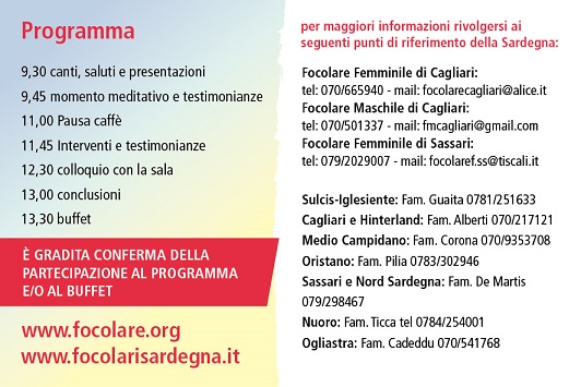 Il 15 giugno prossimo presso il Salone della Parrocchia del Sacro Cuore in Cabras, il Movimento dei Focolari ha organizzato un importante incontro rivolto a sacerdoti, religiosi e seminaristi.