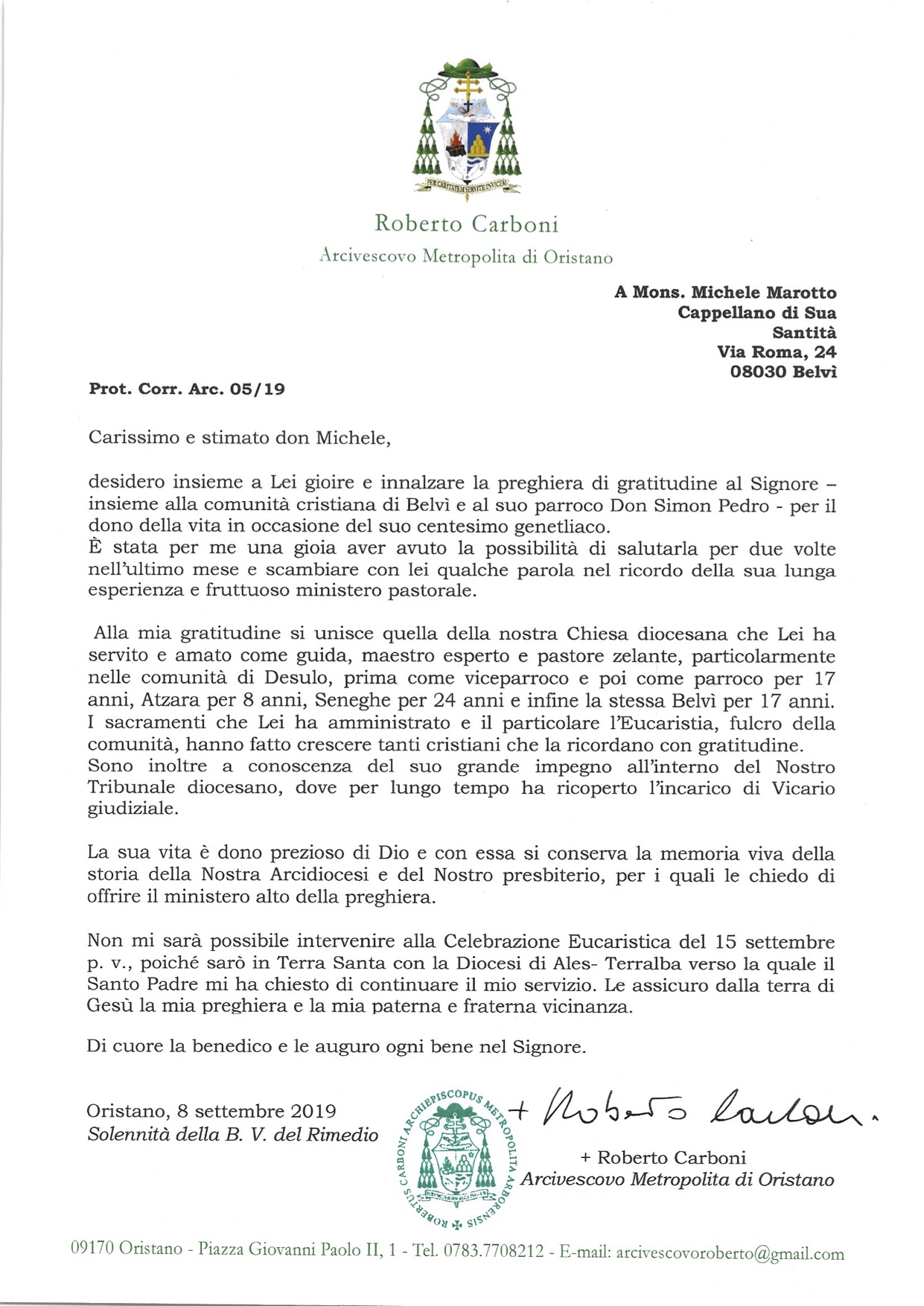 Lunedì 9 settembre 2019, in occasione della ricorrenza del 100° genetliaco di mons. Michele Marotto, decano del presbiterio arborense, mons. Arcivescovo gli ha indirizzato una lettera augurale in cui, insieme alla gratitudine a Dio per il dono della vita e della vocazione presbiterale esprime la gratitudine al sacerdote centenario per il servizio svolto in favore delle comunità parrocchiali di Desulo, Atzara, Seneghe e Belvì e alla comunità diocesana arborense in 76 anni di ministero, chiedendogli di continuare il suo servizio nel ministero alto della preghiera per l’Arcidiocesi ed il presbiterio arborense.