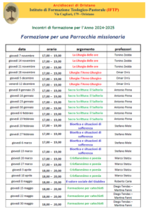 Sarà proposto verso la fine dell’anno un percorso per Catechiste e Catechisti, ma aperto a tutti, che arricchirà quanto l’Ufficio Catechistico proporrà durante l’anno, non solo a Oristano ma nei vari Vicariati foranei.
