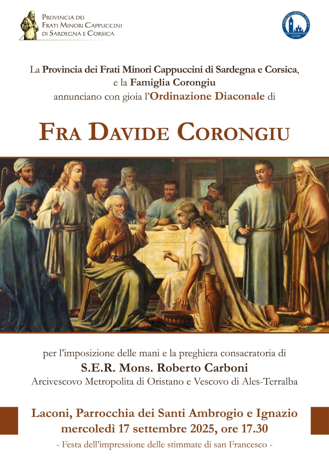 La famiglia dei frati cappuccini di Sardegna annuncia che mercoledì 17 settembre 2025, nella chiesa parrocchiale di Laconi verrà ordinato diacono fra Davide Corongiu, giovane laconese.
