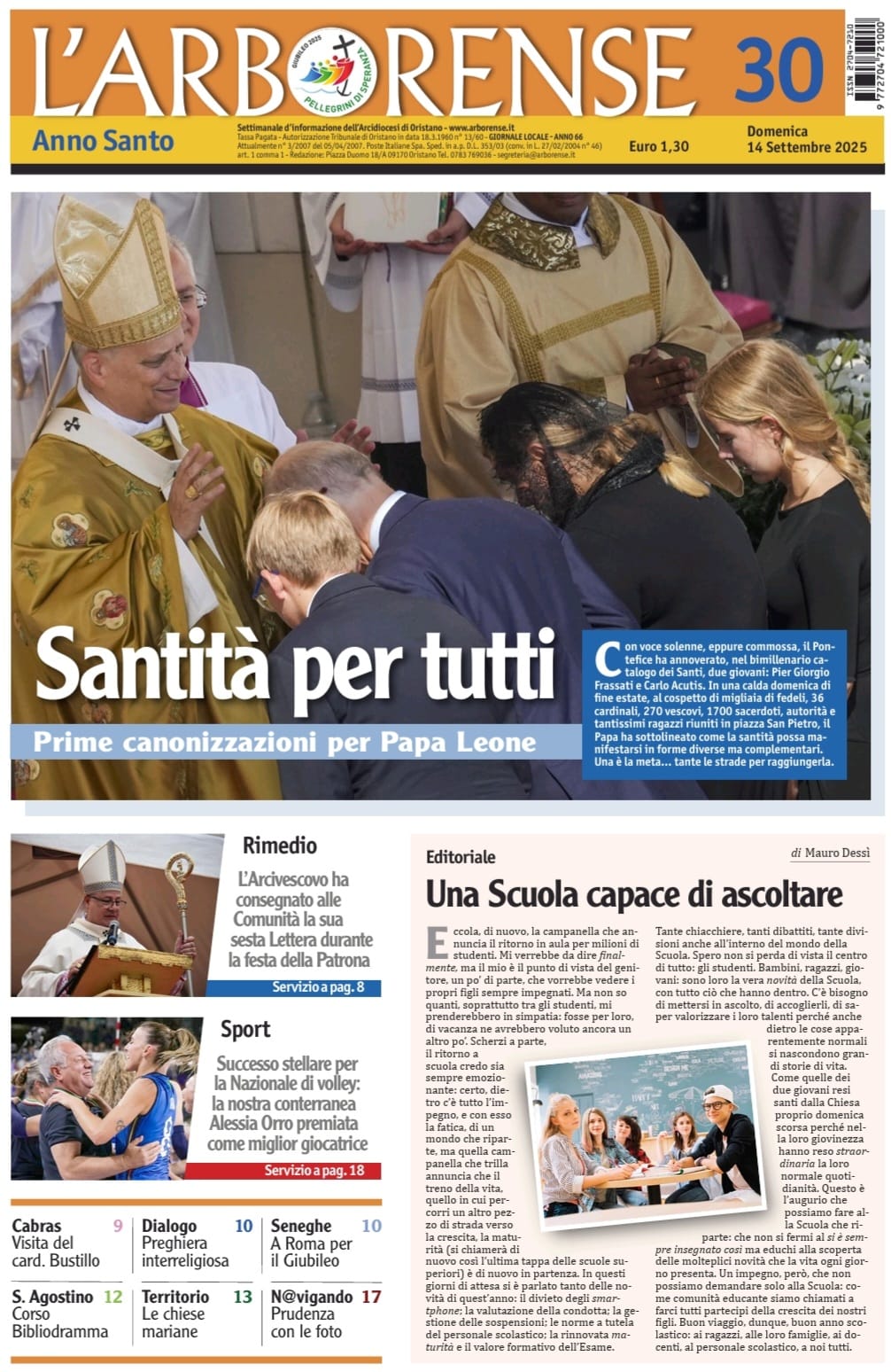 Prima pagina dedicata alle canonizzazione di domenica scorsa 7 settembre: le prime di papa Leone XIV che ha portato agli onori degli altari Pier Giorgio Frassati e Carlo Acutis di cui se ne parla all’interno in approfondimento.
