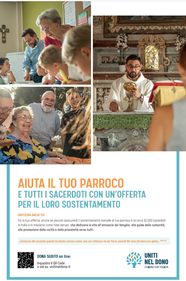 La Giornata Nazionale, spiega il responsabile del Servizio Promozione per il Sostegno Economico alla Chiesa cattolica, Massimo Monzio Compagnoni, richiama l’attenzione sull’importanza della missione dei sacerdoti, sulla bellezza del loro servizio e sulla corresponsabilità richiesta alla comunità cattolica. È un’opportunità per esprimere gratitudine verso uomini di fede, speranza e prossimità, che ogni giorno offrono la loro vita per il bene delle comunità. Sostenerli non è solo un atto economico, ma un segno concreto di appartenenza e partecipazione ecclesiale. Spesso si crede, erroneamente, che l’obolo domenicale sia sufficiente a garantire il sostentamento del clero. Ma in molte realtà, queste risorse non coprono il necessario. Fa riflettere il fatto che oggi le offerte deducibili a favore dell’Istituto Centrale per il Sostentamento del Clero (ICSC), aggiunge Monzio Compagnoni, coprono meno del 2% del fabbisogno annuale complessivo. Dietro ogni sacerdote c’è una vita interamente dedicata agli altri. E ogni offerta, anche la più piccola, è un modo per dire grazie e sostenere concretamente i nostri preti, permettendo loro di continuare a essere presenza operosa nelle parrocchie.