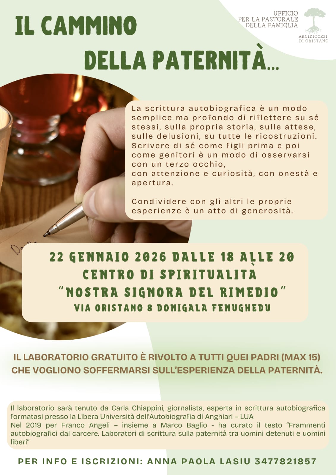 L’Ufficio diocesano per la Pastorale Familiare promuove, per il 22 gennaio, dalle 18 alle 20, nel Centro di spiritualità Nostra Signora del Rimedio a Donigala Fenughedu, un laboratorio di scrittura autobiografica rivolto ai padri di famiglia che desiderano soffermarsi e riflettere sull’esperienza della paternità.