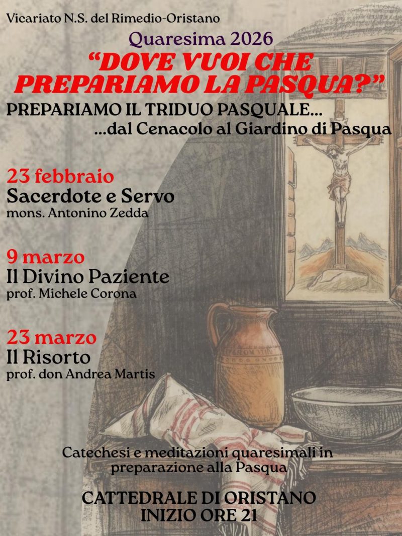 Tornano in Cattedrale, a Oristano, le catechesi che, nel passato, hanno sempre animato il tempo di Quaresima in città. A promuoverle è il Vicariato Urbano Nostra Signora del Rimedio guidato da mons. Gianfranco Murru, recentemente confermato vicario foraneo delle parrocchie cittadine.