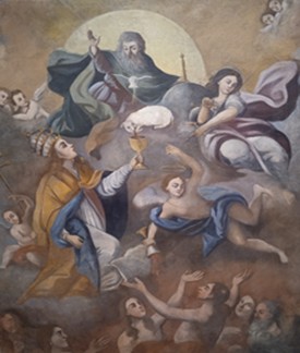 Nelle immagini: in alto uno schizzo dei lavori di restauro della chiesa e del campanile; in basso, il Quadro delle Anime del Marghinotti restaurato grazie al contributo dei parrocchiani.