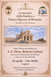 Il 22 aprile celebrerà mons. Roberto Carboni, Arcivescovo Metropolita di Oristano e Vescovo di Ales-Terralba che, su richiesta dell’Arcivescovo di Cagliari, mons. G. Baturi, è stato chiamato anche a far parte del Comitato d’onore, presieduto dal S. Em.za Rev.ma Il Cardinale Matteo Maria Zuppi, in occasione del centenario della dedicazione della Basilica di Nostra Signora di Bonaria (23 aprile 1926) e del periodo giubilare che avrà inizio il 15 di aprile 2026 e avrà termine il 5 luglio 2026.