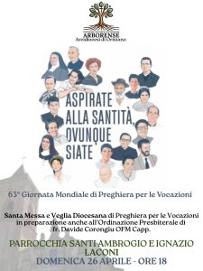 Nella nostra Arcidiocesi sarà celebrata una Veglia di preghiera a Laconi, a partire dalle ore 18, promossa dall’équipe diocesana di Pastorale Giovanile Vocazionale. L’incontro sarà occasione anche per preparare l’Ordinazione sacerdotale di fra Davide Corongiu, frate cappuccino originario di Laconi che diventerà presbitero venerdì 8 maggio sempre a Laconi per mano di mons. Roberto Carboni.