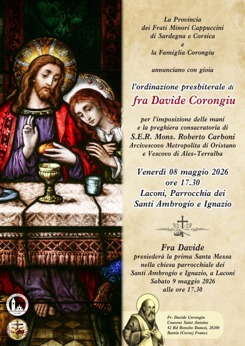 La Provincia dei frati cappuccini di Sardegna e Corsica e la famiglia Corongiu annunciano con gioia l’Ordinazione presbiterale di fra Davide, 29 anni, originario di Laconi che avverrà venerdì 8 maggio 2026 nella chiesa parrocchiale laconese per mano dell’Arcivescovo Roberto.