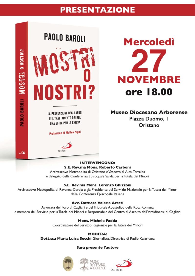 Mostri o Nostri? La prevenzione degli abusi e il trattamento dei rei: una sfida per la Chiesa” è il titolo del libro di don Paolo Baroli, nostro presbitero arborense e psicologo, recentemente pubblicato dalle Edizioni San Paolo, che sarà presentato a Oristano mercoledì 27 novembre 2024 alle ore 18 nella Sala San Pio X del Museo Diocesano Arborense.